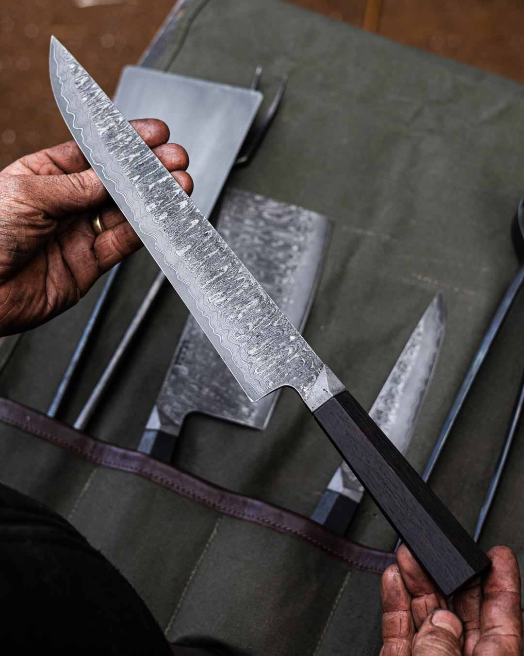 Well suited to brisket, roasts, and larger joints, it’s equally at home portioning straight off the fire or carving at the table. Ground thin behind the edge, it takes a keen edge easily and holds it through extended use.