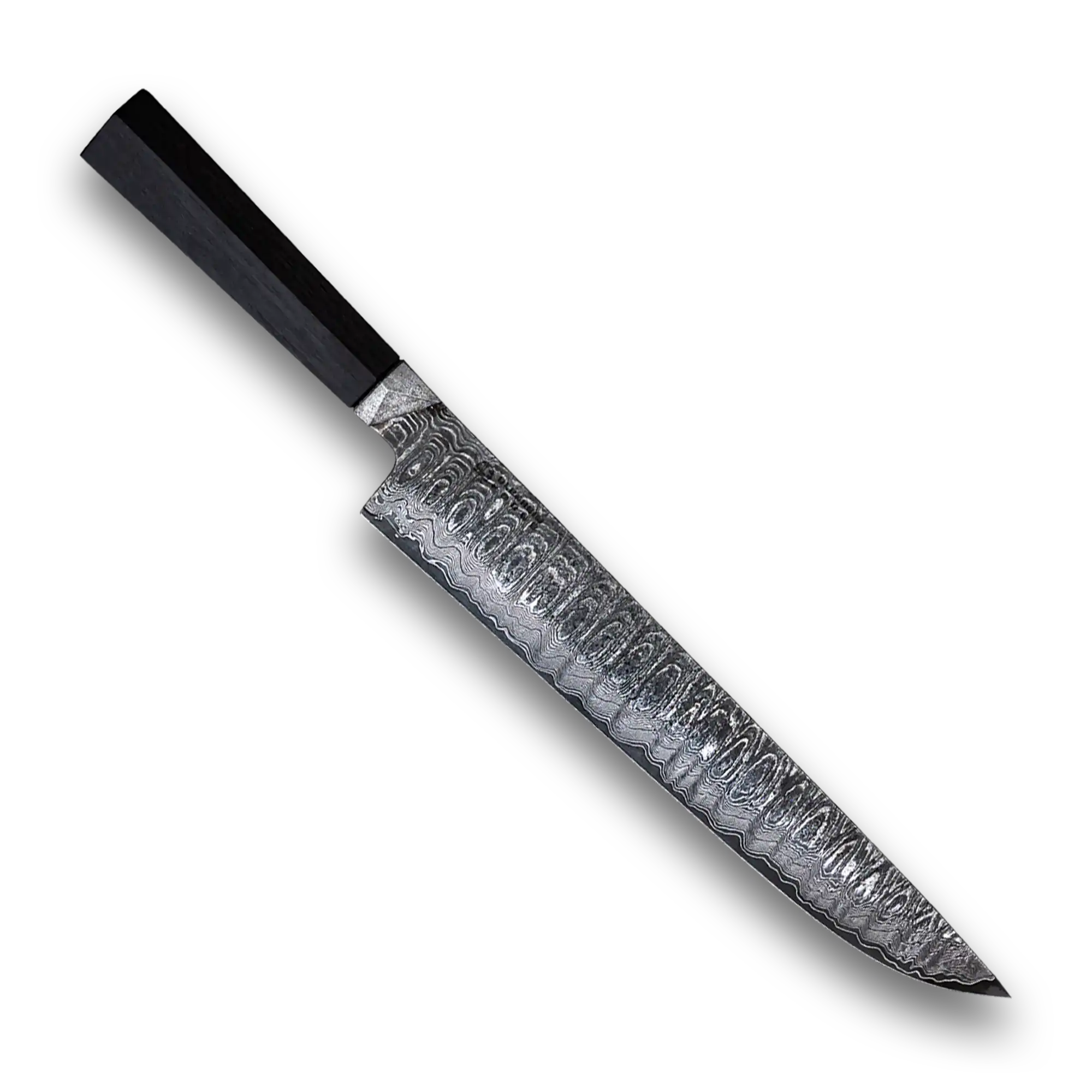 A long, thick-spined slicer with enough weight to carry through larger cuts, built for carving and portioning with control. The extra spine thickness adds stability through the cut, while the gentle convex grind helps the blade move cleanly through meat without sticking.