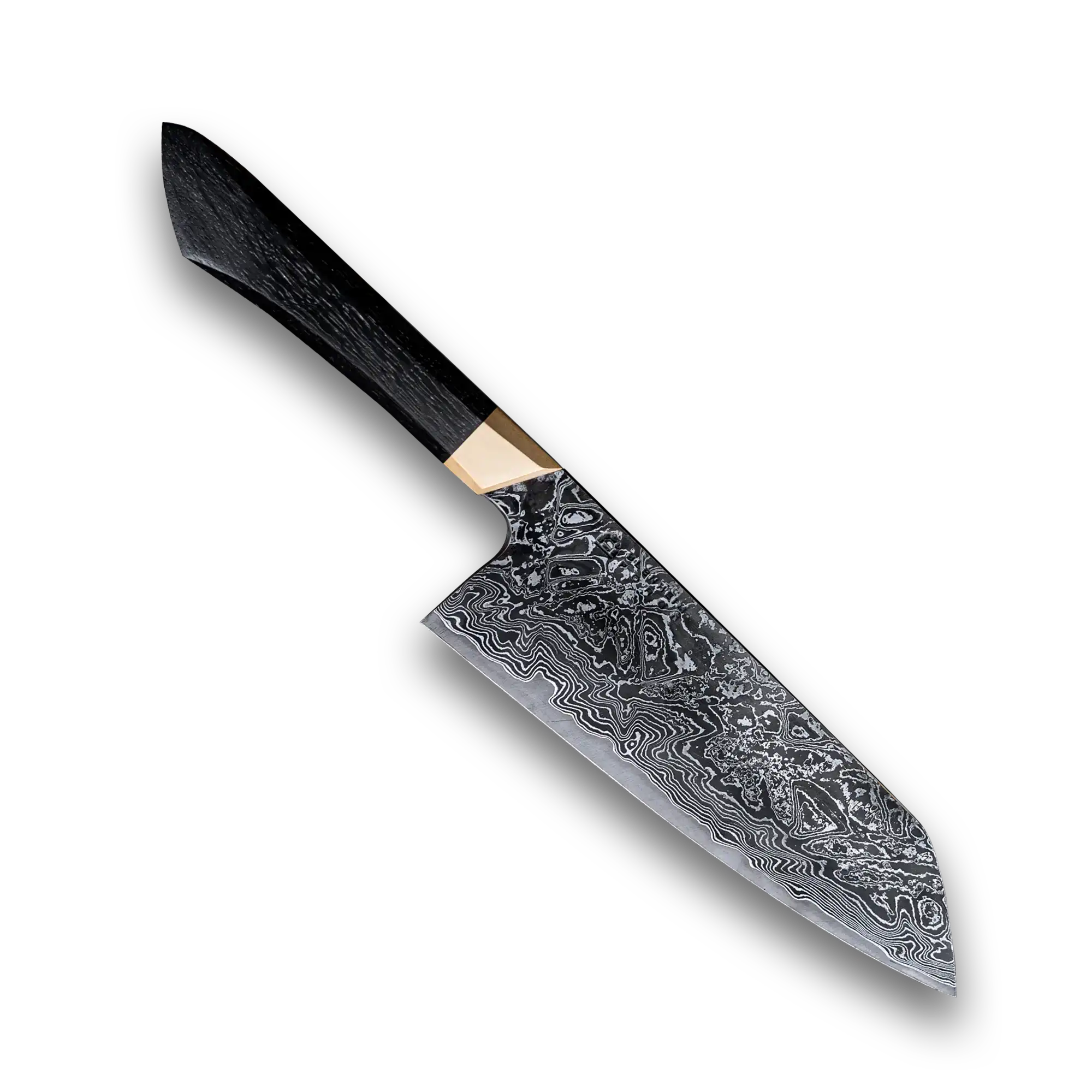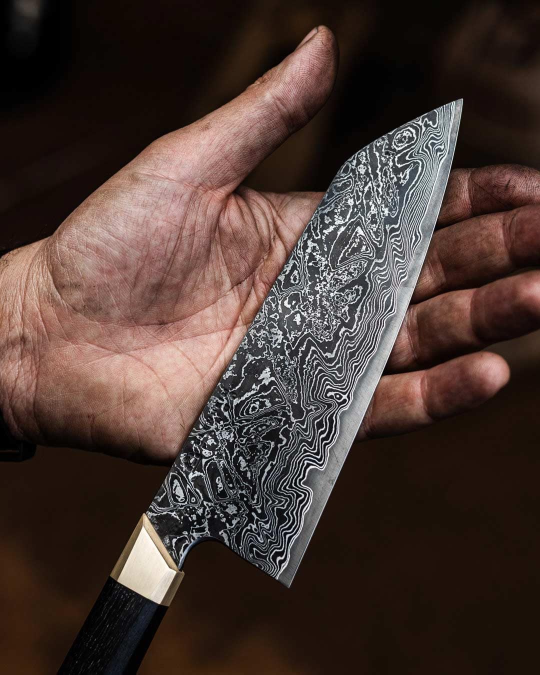 The handle is shaped from 5000 year old bog oak, selected for its deep, almost black tone and subtle grain. A brass ferrule, machined from solid bar and set at a 30 degree forward angle, naturally encourages a pinch grip. The choil is softened and polished for comfort during extended sessions, and the sculpted angular handle tapers in both directions, with its fullest point sitting securely in the palm.