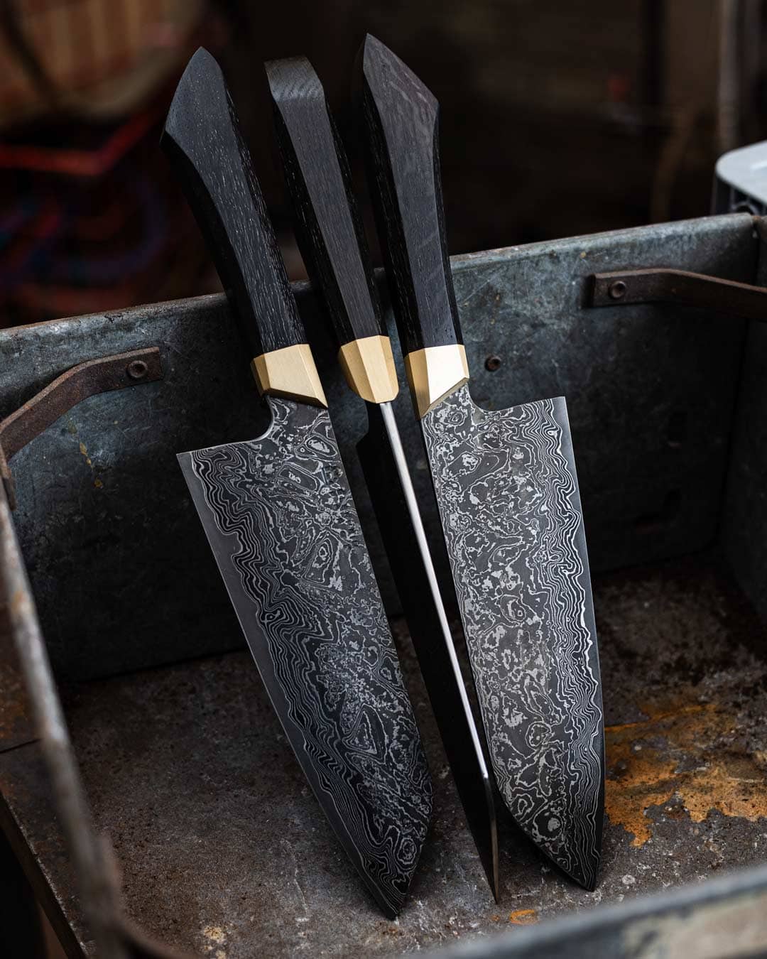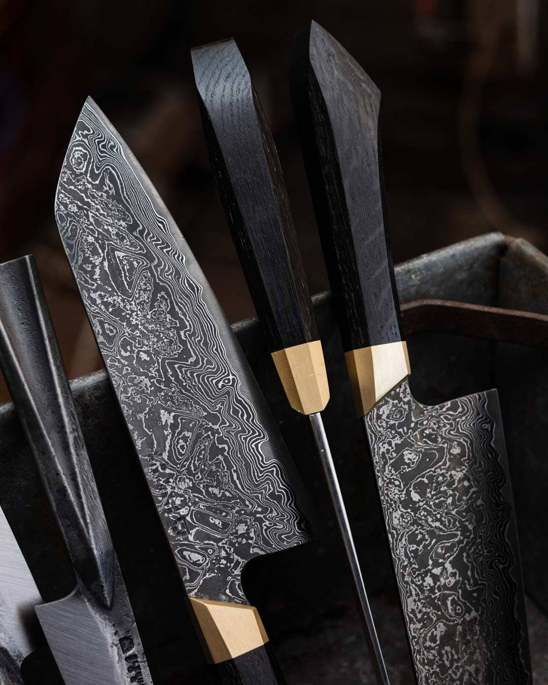 The core steel is our own Blenheim Black carbon steel, a house alloy made specifically for us to echo the feel of Japanese high performance tool steels while being easy to sharpen and maintain the keenest edge. For the cladding, Jon has built on our collective experience with different Damascus recipes with a very specific goal in mind: to create an extremely durable jacket that still responds well to thinning on a whetstone. He has chosen a mix of low and high carbon steels in varying thicknesses, stacked to give around 70 layers in each blade. The result is a stiff, tough blade with excellent edge stability. The Damascus is rough forged under fullering dies, so the pattern is pressed deep into the surface, giving every knife a slightly different topography and a unique flow of lines along the blade.