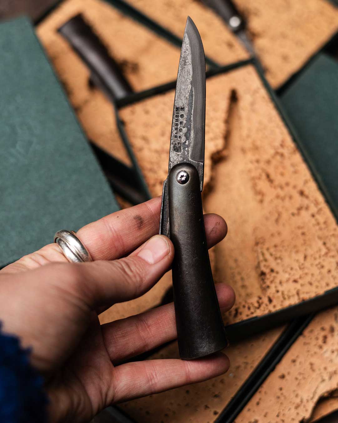This year’s pocket knives also feature bronze handles, something we have been developing for a long time. Finding a foundry prepared to work with us on this fiddly design wasn’t easy, but a small firm in Devon stepped up to the task and has done a wonderful job casting and fettling these components. Once delivered to us, the handles have been burnished and patinated, leaving a dark finish which, over time and with use, should pick up beautiful highlights.