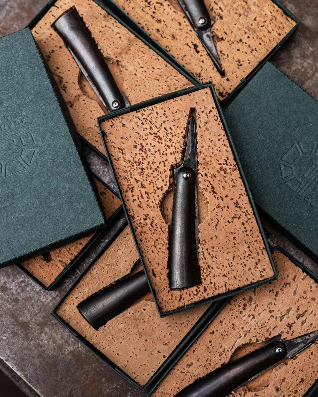 James has also been experimenting with some new packaging materials and has had some beautiful boxes folded up by W. MacCarthy & Sons, a local 5th-generation, family-run business established in 1880. They have used a textured recycled card with an unusual perforated corner fold detail. Inside, we have made some natural cork inserts to keep the blades safe on their journey to you.