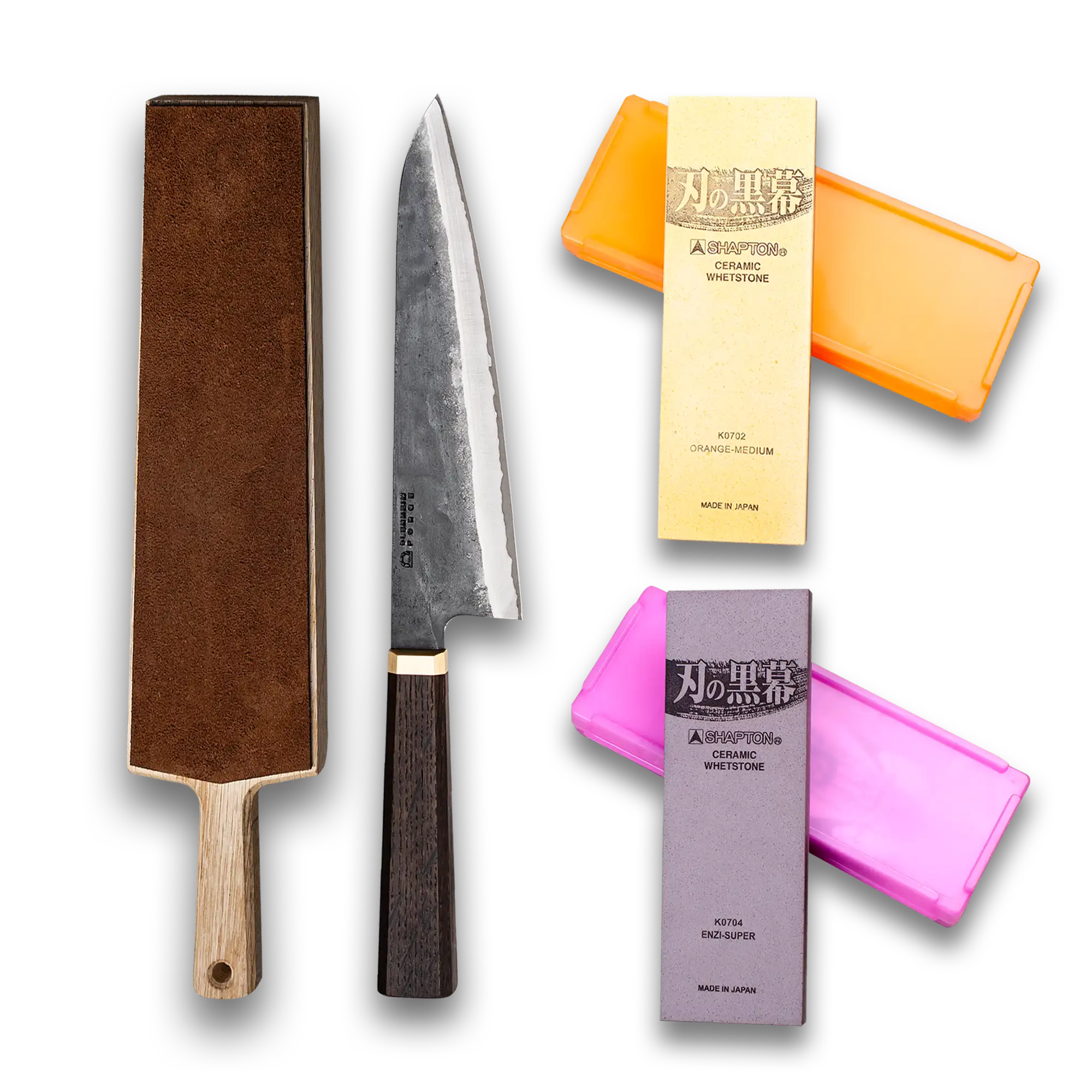 The perfect bundle for a professional chef or serious home cook looking to upgrade both their cutting and sharpening setup. This pairing combines our go-to gyuto with the exact sharpening progression we use in the workshop every day. The Shapton Pro 1000 and 5000 offer fast cutting, consistent feedback and a simple, reliable route to a razor edge, finished off with a leather strop to keep the blade performing at its best.
