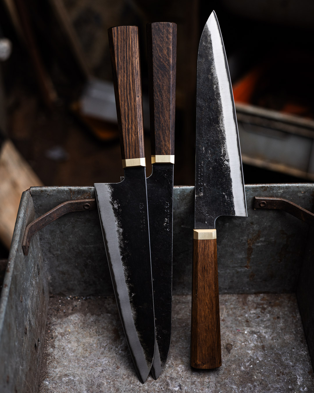 The Classic Range knives have a Japanese Blue Paper Steel core with folded iron cladding. These knives are made from carbon steel, which provides a very fine edge that sharpens easily. It’s normal for the surface of carbon steel to change colour when cutting wet or acidic foods. In time, and with use, the blade will develop a protective outer layer (patina) that helps prevent it from rusting. The Classic range blades are all left with a beautifully textured forge finish, and the handles are made from English Walnut with a solid copper ferrule.