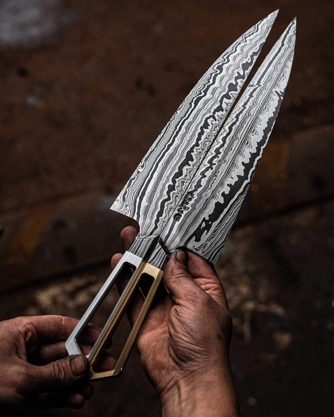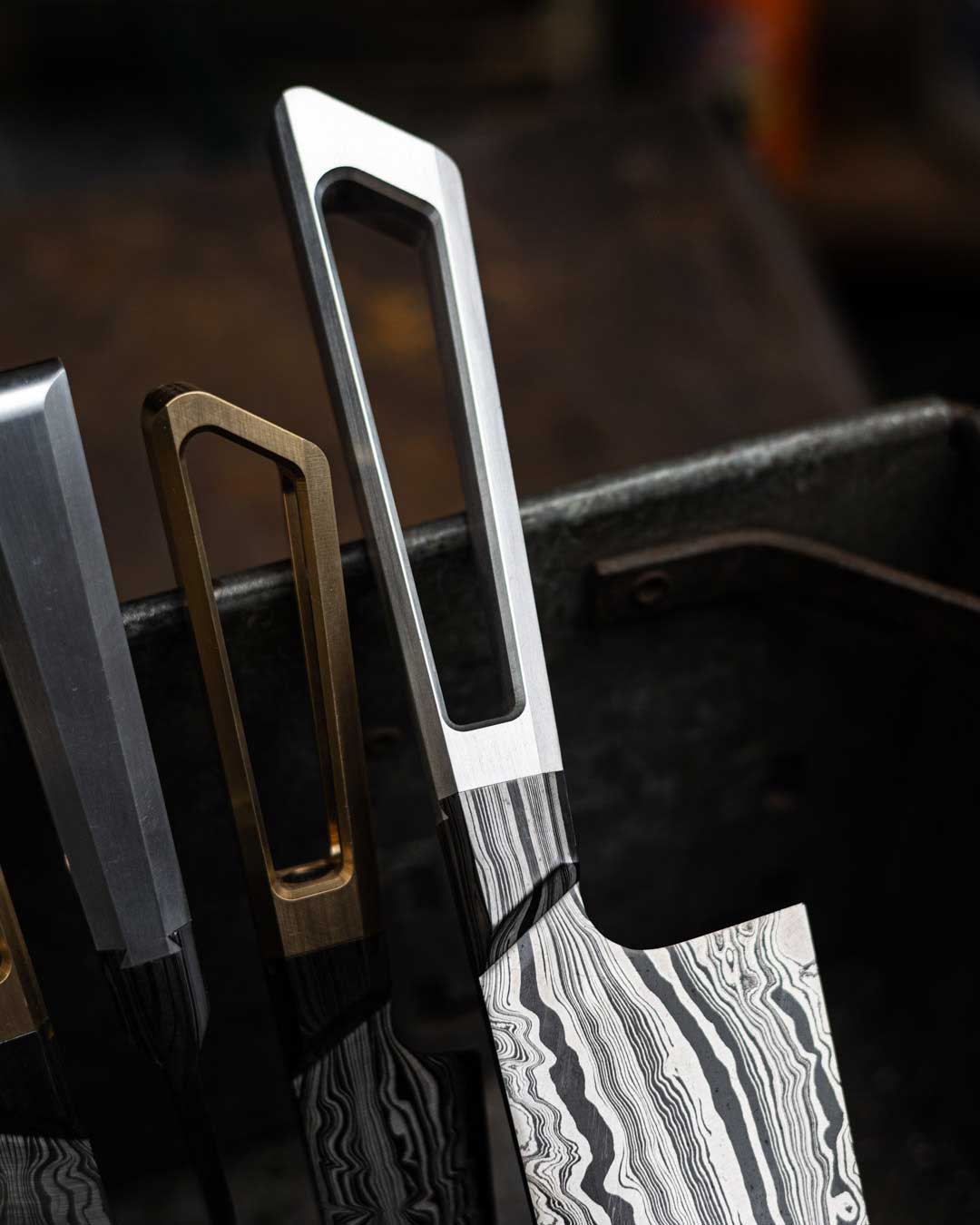 Jon’s Damascus Steel integrals, with their boundary-pushing handle design, are back for another year. He’s gone for the same skeletal handle- available in anodised aluminium, or in a slightly heavier brass option- and has spiced up the blades by tweaking the profile and forging them from a billet of laddered “W”- pattern Damascus.
