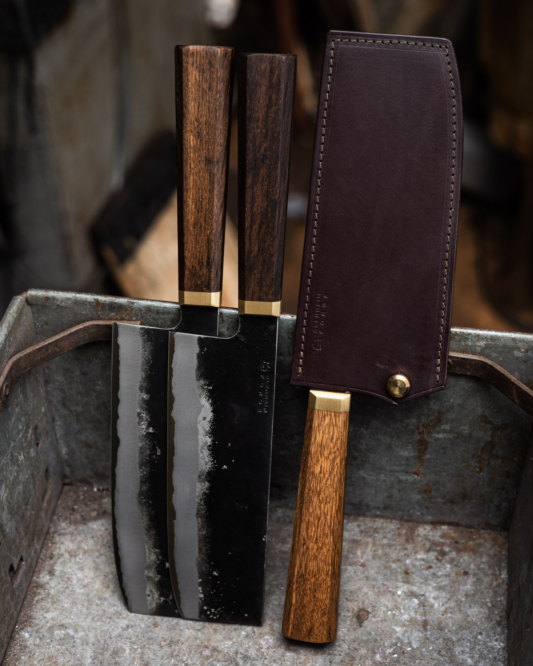 Our take on the classic Japanese vegetable knife with stainless steel cladding to provide protection against rust and corrosion. The flat edge profile makes it easy to apply a precise, very fine grind and they are particularly easy to sharpen. In addition to being great fun to make, they are also great to use. The deep flat blade makes them perfect for fast, precise chopping of vegetables. We forge these blades thinner than our other knives as this helps them glide through hard vegetables without wedging.