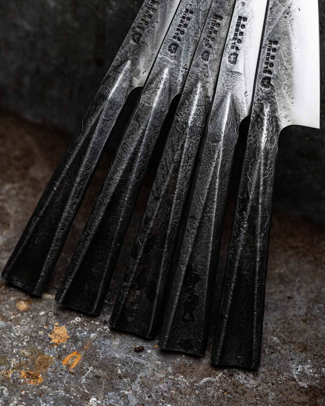 Drop forging is a heavy industrial process, designed to move large volumes of hot steel quickly and efficiently. The blanks are forged in Sheffield as robust preforms, establishing the overall handle shape and rough structure of the blade. Once they arrive in our workshop, we refine each blade to its final form using a combination of smaller power hammers and hand forging over an anvil, From these rough forgings, the knives are heat treated, ground, and sharpened with the same attention to detail as the rest of our work.