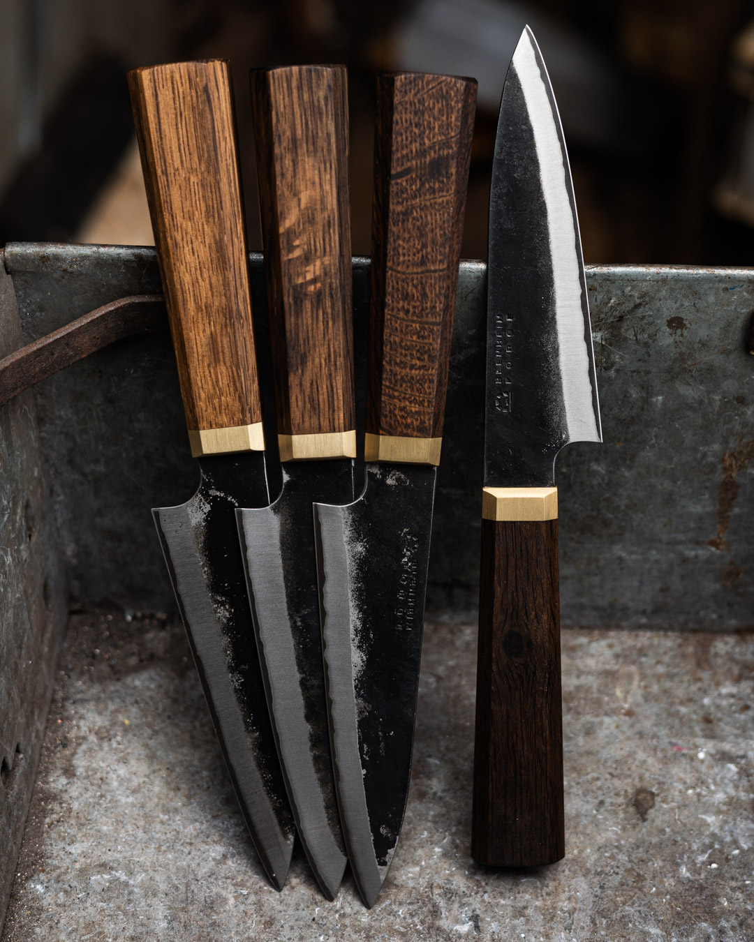 The Stainless Clad range blades have a Japanese Blue Paper Super Steel core with a stainless steel cladding and forged finish. These blades are hand forged with a similar high-performance Japanese steel to our Classic Range but are simpler to look after because they have a stainless cladding on the outside, making the majority of the blade resistant to corrosion. The Stainless Range handles are made of fumed oak with a solid brass ferrule. Both Classic and Stainless Clad Range blades are entirely hand forged and tempered to a high hardness resulting in an enhanced cutting ability with great edge retention.