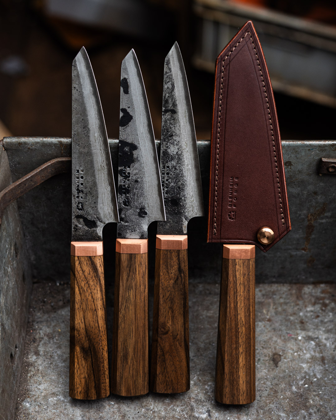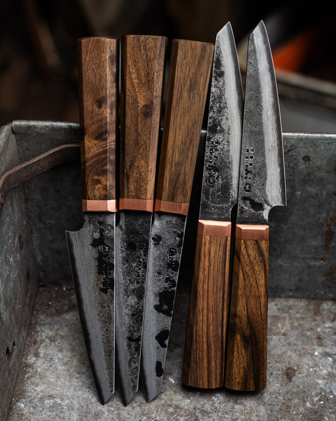The Classic Range knives have a Japanese Blue Paper Steel core with folded iron cladding. These knives are made from carbon steel, which provides a very fine edge that sharpens easily. It’s normal for the surface of carbon steel to change colour when cutting wet or acidic foods. In time, and with use, the blade will develop a protective outer layer (patina) that helps prevent it from rusting. The Classic range blades are all left with a beautifully textured forge finish, and the handles are made from English Walnut with a solid copper ferrule.